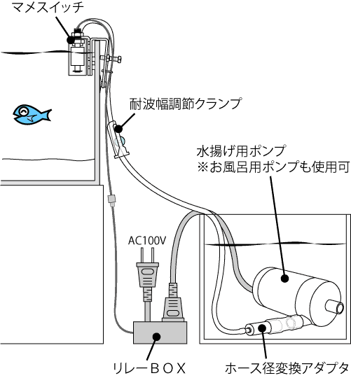 (オーバフロー水槽での使用はサンプ水槽にマメスイッチを設置します)