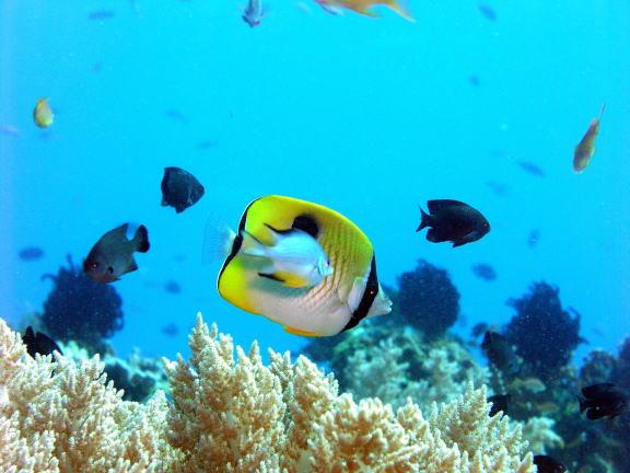 ※画像中心で重なっている魚の奥(イッテンチョウチョウウオ)手前(ナミスズメダイ) 【 生息帯 】 慶良間・益田・インド洋・中 西部太平洋・サンゴ礁域 【 体長 】 14cm 【 特徴 】 体全体は白色で目と尾元に黒の縦帯、背部に黒点が入る